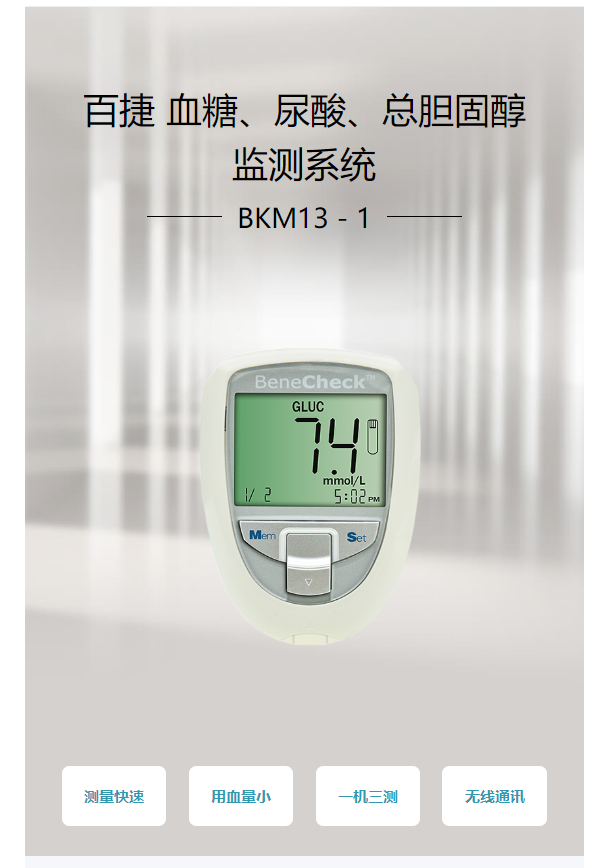百捷BeneCheck 血糖、尿酸、總膽固醇監(jiān)測(cè)系統(tǒng) BKM13-1產(chǎn)品說明: