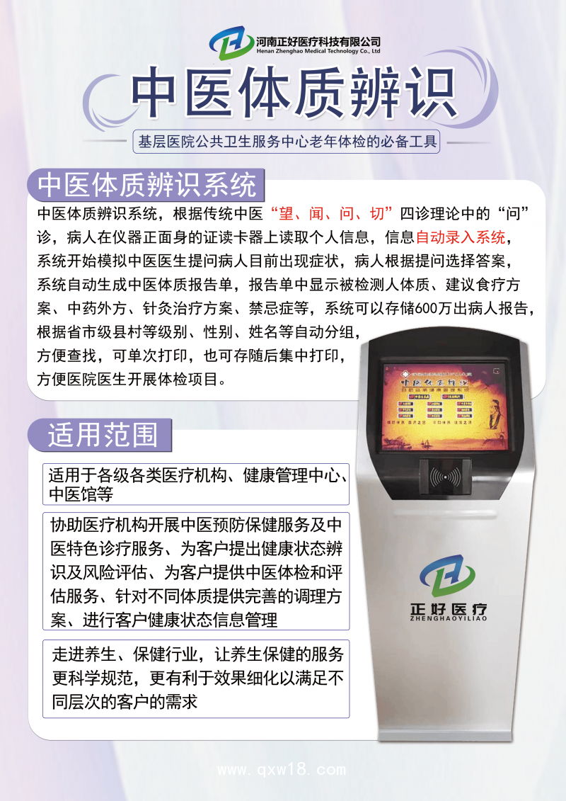 中醫(yī)體質(zhì)辨識(shí)系統(tǒng),根據(jù)傳統(tǒng)中醫(yī)“望、聞、問、切”四診理論中的“問診,病人在儀器正面身的證讀卡器上讀取個(gè)人信息,信息自動(dòng)錄入系統(tǒng)系統(tǒng)開始模擬中醫(yī)醫(yī)生提問病人目前出現(xiàn)癥狀,病人根據(jù)提問選擇答案系統(tǒng)自動(dòng)生成中醫(yī)體質(zhì)報(bào)告單,報(bào)告單中顯示被檢測(cè)人體質(zhì)、建議食療方案、中藥外方、針灸治療方案、禁忌癥等,系統(tǒng)可以存儲(chǔ)600萬出病人報(bào)告根據(jù)省市級(jí)縣村等級(jí)別、性別、姓名等自動(dòng)分組,方便查找,可單次打印,也可存隨后集中打印,方便醫(yī)院醫(yī)生開展體檢項(xiàng)目。