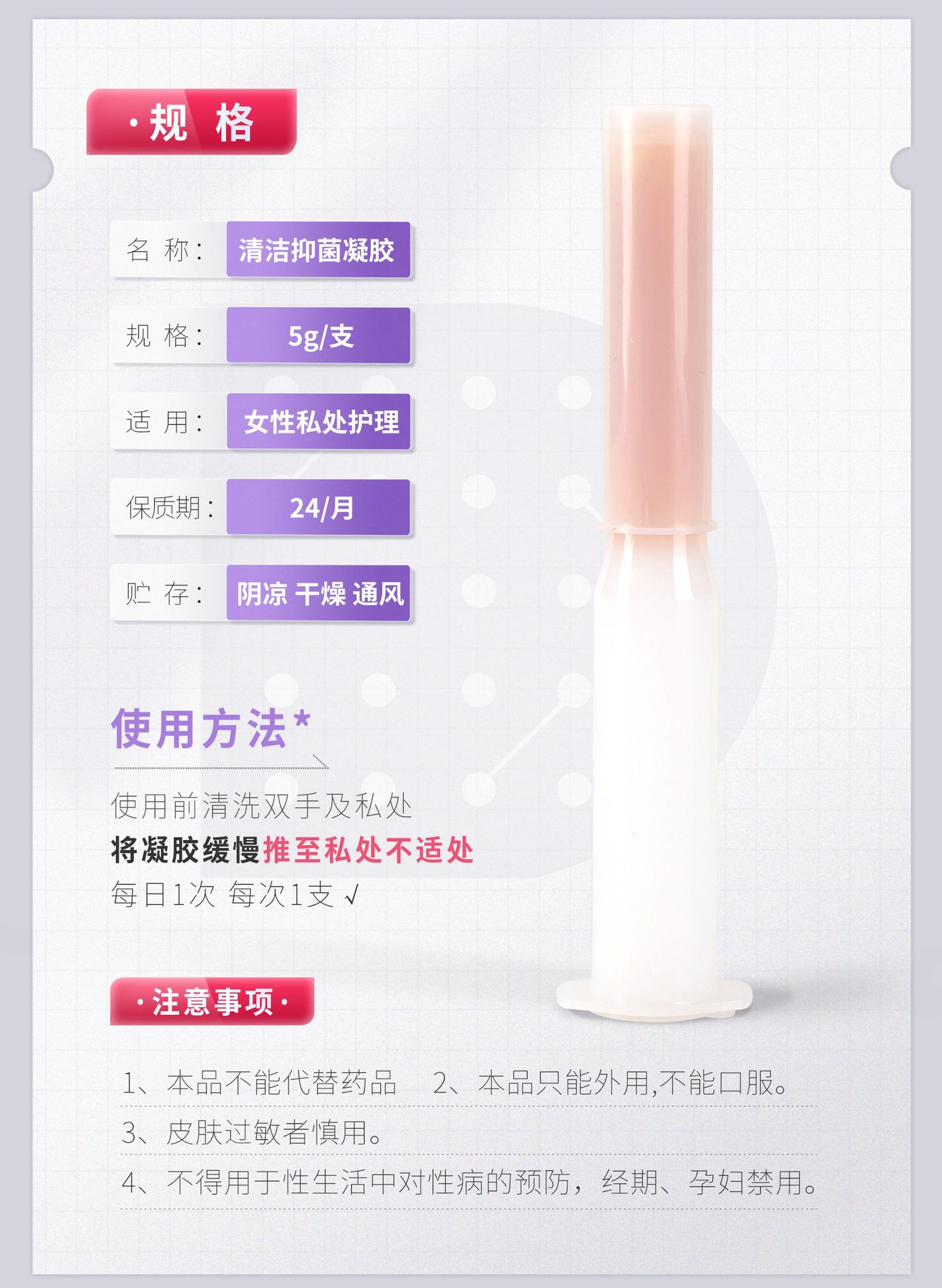 3.?把推桿放入推注器內(nèi),取下推注器底端封口帽,將推注器緩慢推入陰道深處,推壓推桿,凝膠即被推入陰道內(nèi)。