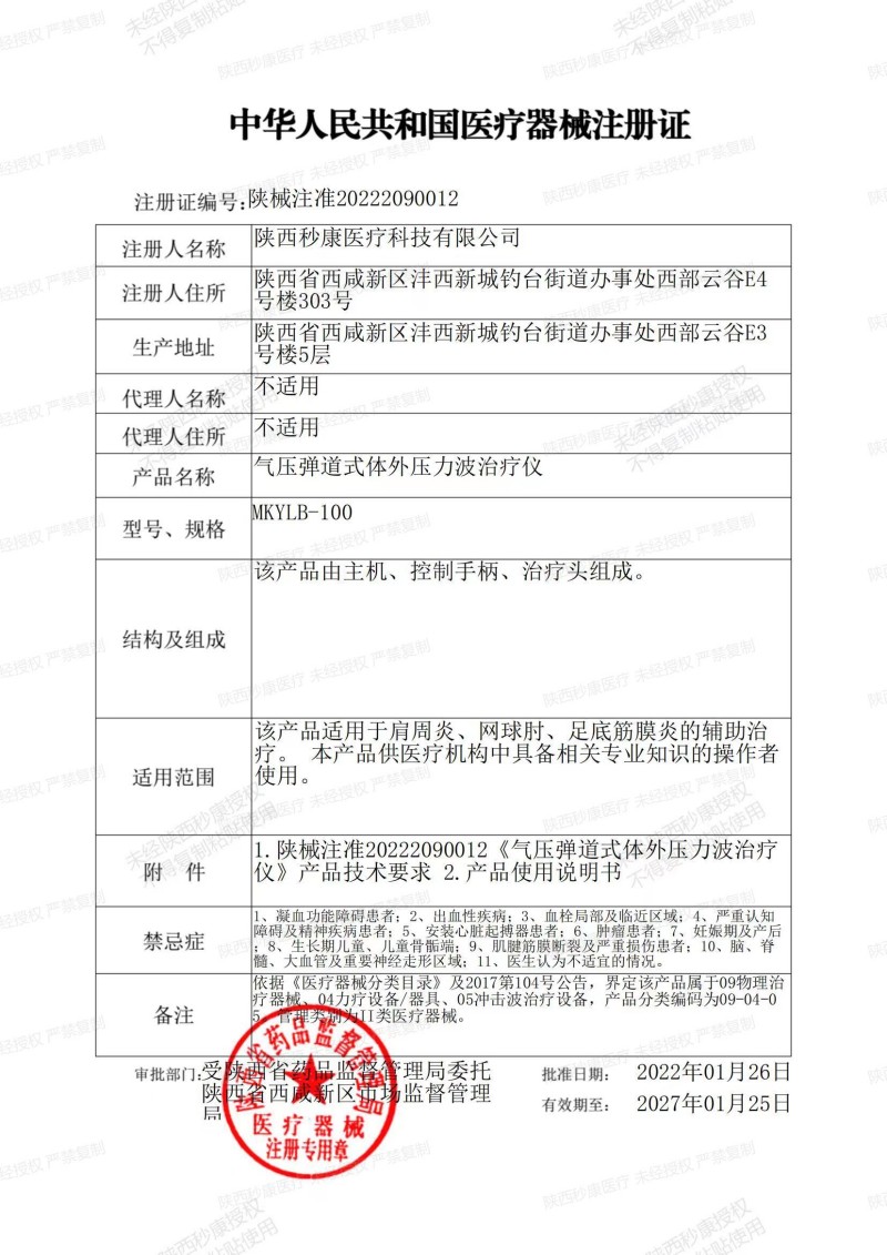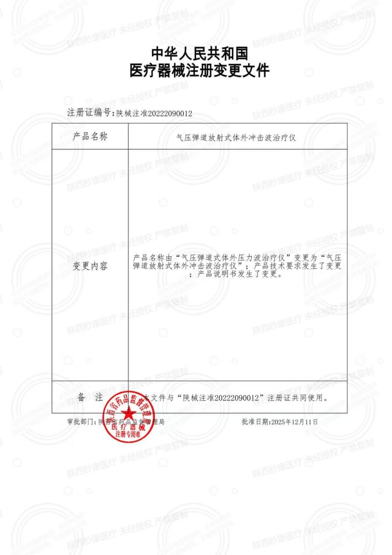 備注 | 本文件與“陜械注準(zhǔn)20222090012《氣壓彈道式體外壓力波治療儀》醫(yī)療器械注冊(cè)證”共同使用。 |