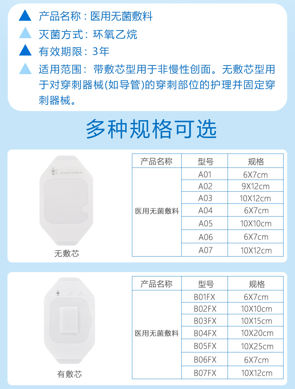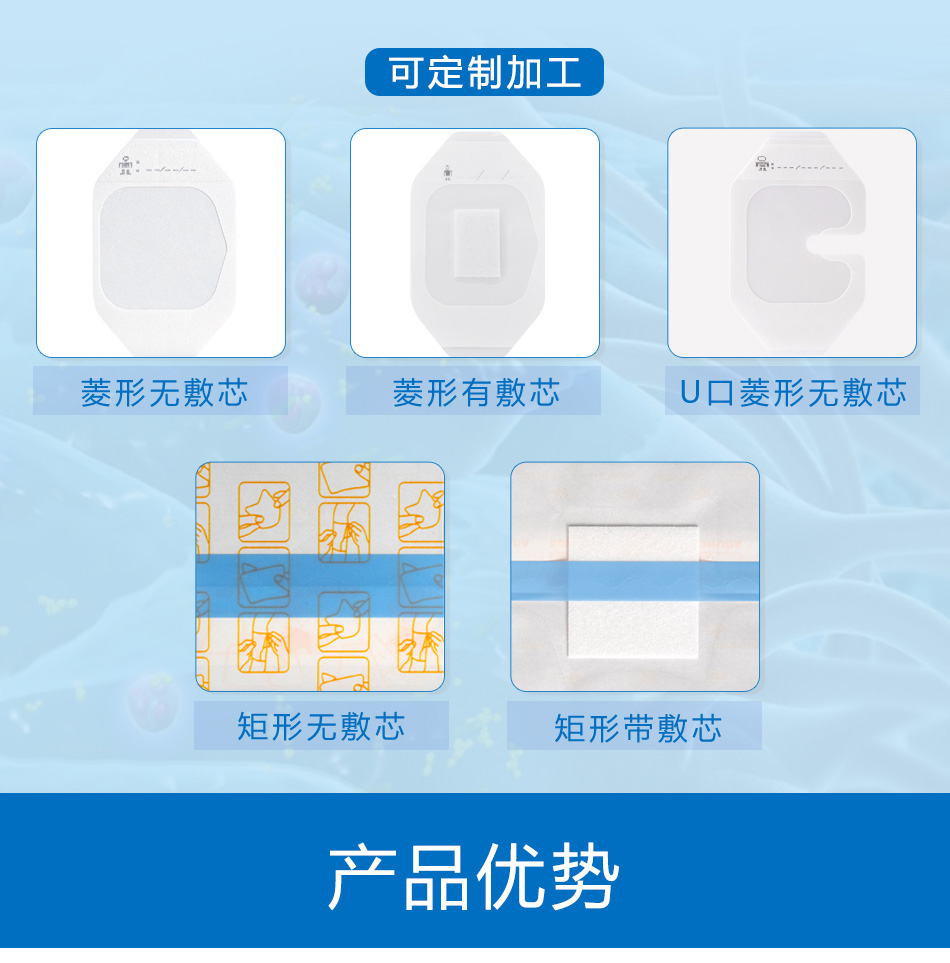 帶敷芯型用于非慢性創(chuàng)面 如淺表性創(chuàng)面、手術(shù)后縫合創(chuàng)面、機(jī)械創(chuàng)傷、小創(chuàng)口、擦傷、切割傷創(chuàng)面、穿刺器械的穿刺部位、I度或淺II度的燒燙傷創(chuàng)面、嬰兒肚臍口創(chuàng)口、激光/光子/果酸換膚/微整形術(shù)后創(chuàng)面)的護(hù)理,為創(chuàng)面愈合提供微環(huán)境。無敷芯型用于對穿刺器械(如導(dǎo)管)的穿刺部位的護(hù)理并固定穿刺器械。