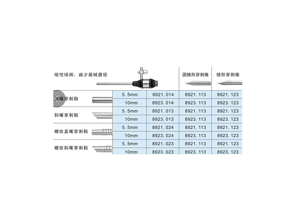 產(chǎn)品說明:穿刺器直嘴穿刺鞘8921.0145.5mm8923.01410mm斜嘴穿刺鞘8921.0135.5mm8923.01310mm螺紋直嘴穿刺鞘8921.0245.5mm8923.02410mm螺紋