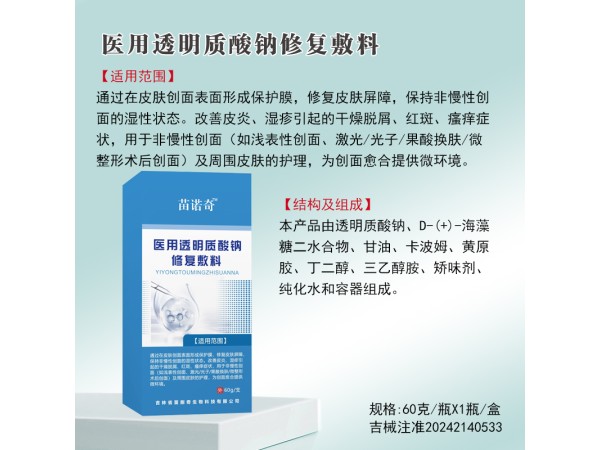 產(chǎn)品說明:[產(chǎn)品名稱] 醫(yī)用透明質(zhì)酸鈉皮膚修復敷料[型號規(guī)格]Ⅰ型:20g/袋、25g/袋、30g/袋、40g/袋、50g/袋。Ⅱ型:3mL/瓶、5mL/瓶、8mL/