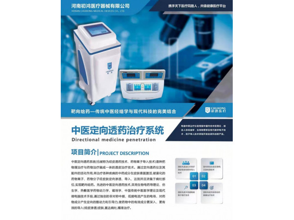 產(chǎn)品說(shuō)明:一:初鴻醫(yī)療---中醫(yī)定向透藥項(xiàng)目詳解與分析中醫(yī)定向透藥治療儀是通過(guò)獨(dú)創(chuàng)的非對(duì)稱(chēng)性中頻電流產(chǎn)生的電場(chǎng),對(duì)藥物分子產(chǎn)生定向的